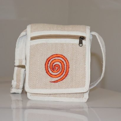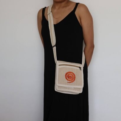 Add a touch of artistic, bohemian charm to your daily look with this 100% pure Himalayan hemp bag. Featuring a vibrant orange spiral embroidery, this eco-friendly accessory is ethically handmade in Nepal, blending traditional craftsmanship with a modern, creative aesthetic.